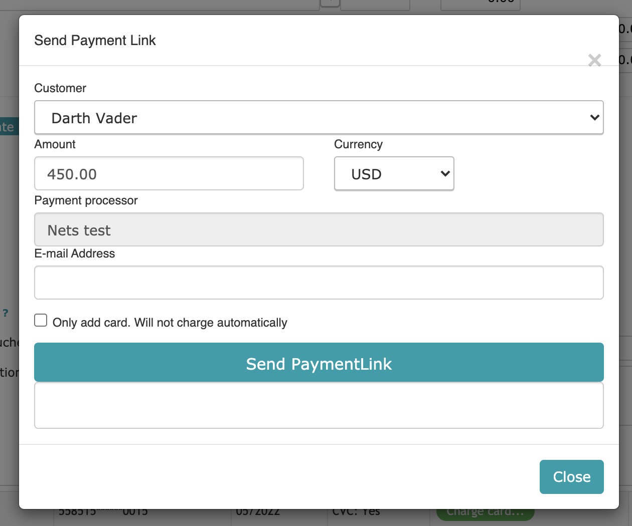 Í greiðsluhnappnum (Charges and Payments flipa) er takki sem heitir Payment Link.